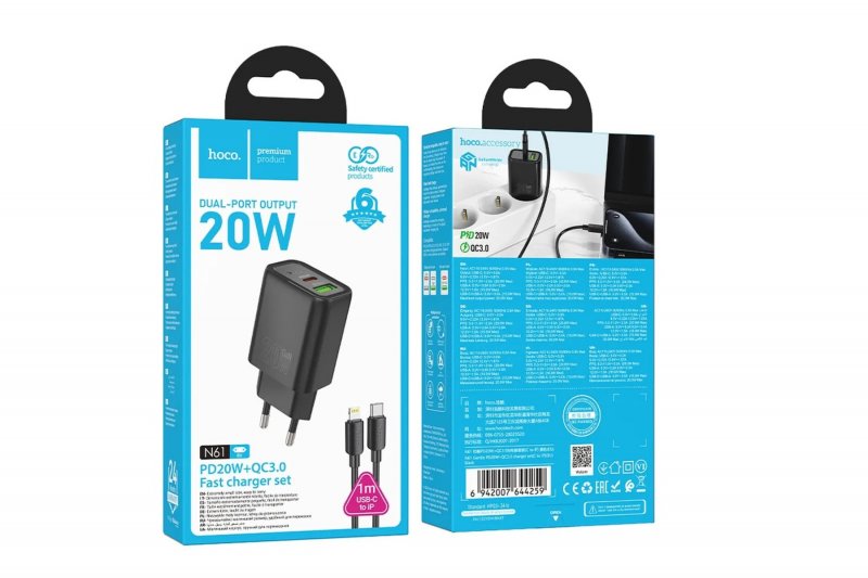 Hoco N61 je mrežni punjač sa funkcijom brzog punjenja i dvostrukim izlazom, omogućavajući istovremeno punjenje dva uređaja. U kompletu dolazi USB-C – Lightning kabl dužine 1 metar, savršen za Apple uređaje.